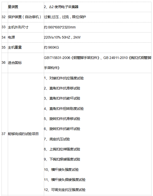 碗扣式腳手架力學性能試驗機主要測試碗扣式鋼管腳手架構(gòu)件的相關(guān)力學性能試驗,適用于對建筑工程中鋼管公稱外徑為48.3mm及51mm的腳手架、井架、模板支撐等使用的由可鍛鑄鐵或鑄鋼制造的扣件的抗拉性能、抗壓性能、抗滑性能、抗破壞性能以及扭轉(zhuǎn)剛度性能等力學性能的測試。
